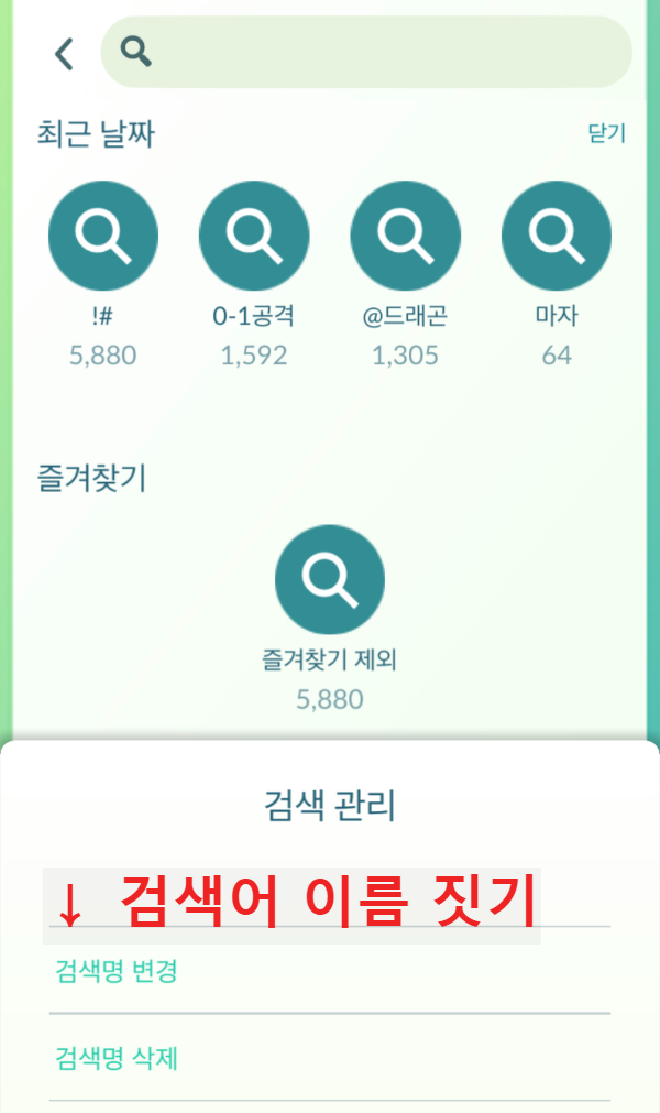 - 최근 날짜의 원하는 검색어 꾹 누르면 즐겨찾기 설정